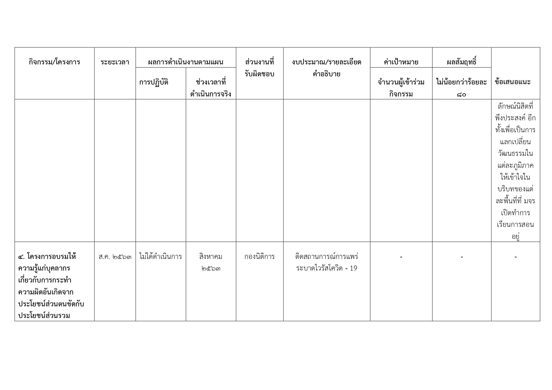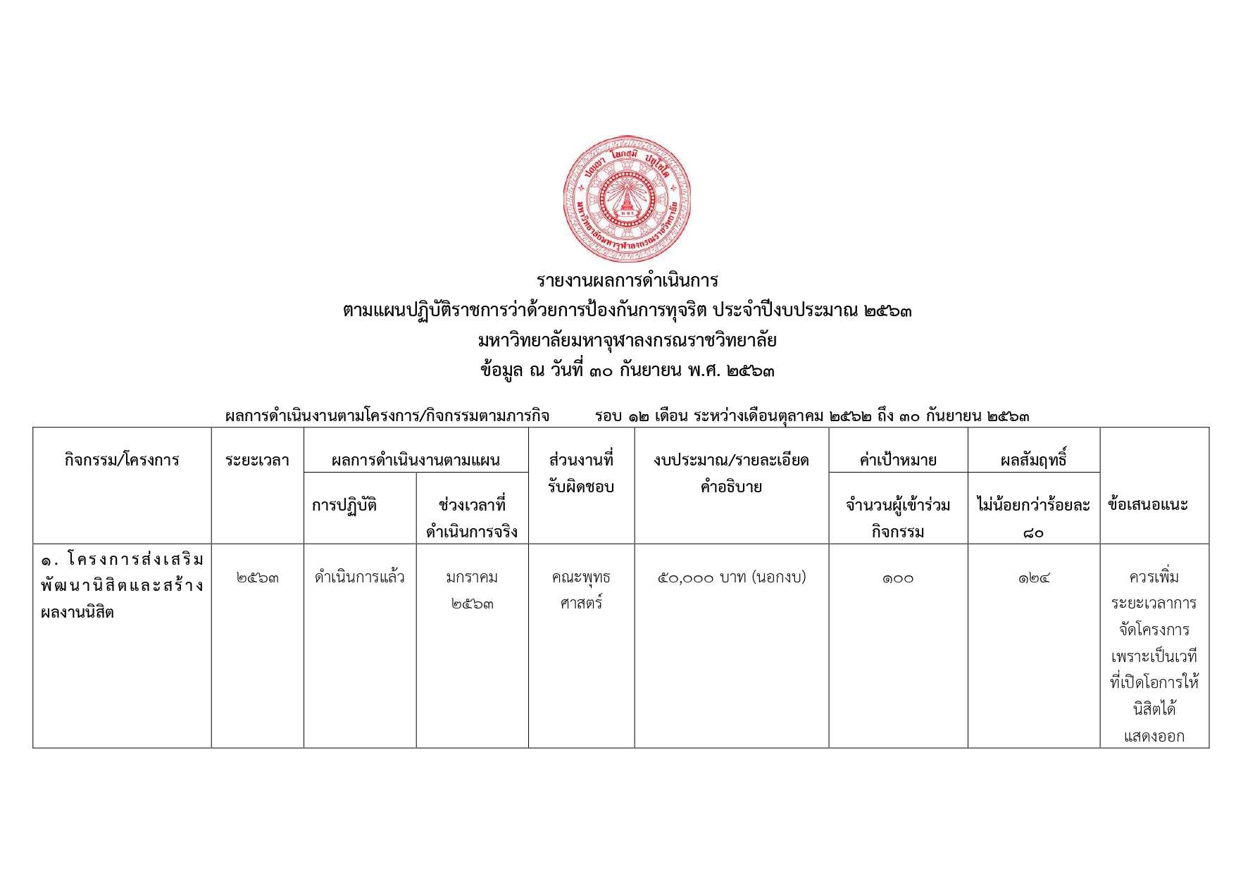 รายงานผลการดำเนินการตามแผนป้องกันการทุจริต ประจำปี ๒๕๖๓ ตามที่มหาวิทยาลัยมหาจุฬาลงกรณราชวิทยาลัย ได้กำหนดให้ดำเนินกิจกรรมภายในแผนป้องกันการทุจริต ประจำปี ๒๕๖๓ โดยกำหนดให้แต่ละส่วนงานรับผิดชอบในกิจกรรมต่าง และให้สรุปผลการดำเนินกิจกรรมนั้นๆ ดังมีรายละเอียดต่อไปนี้