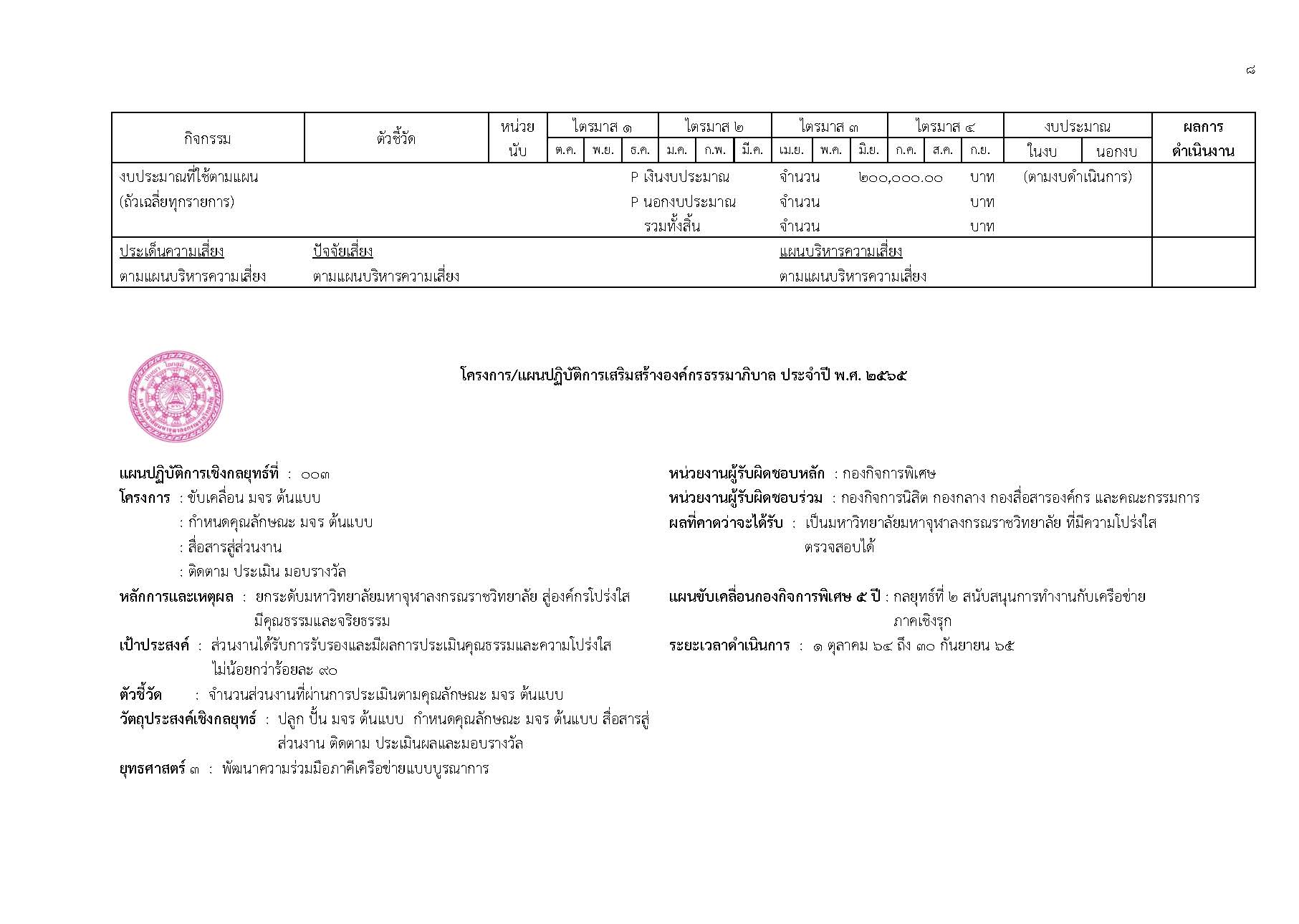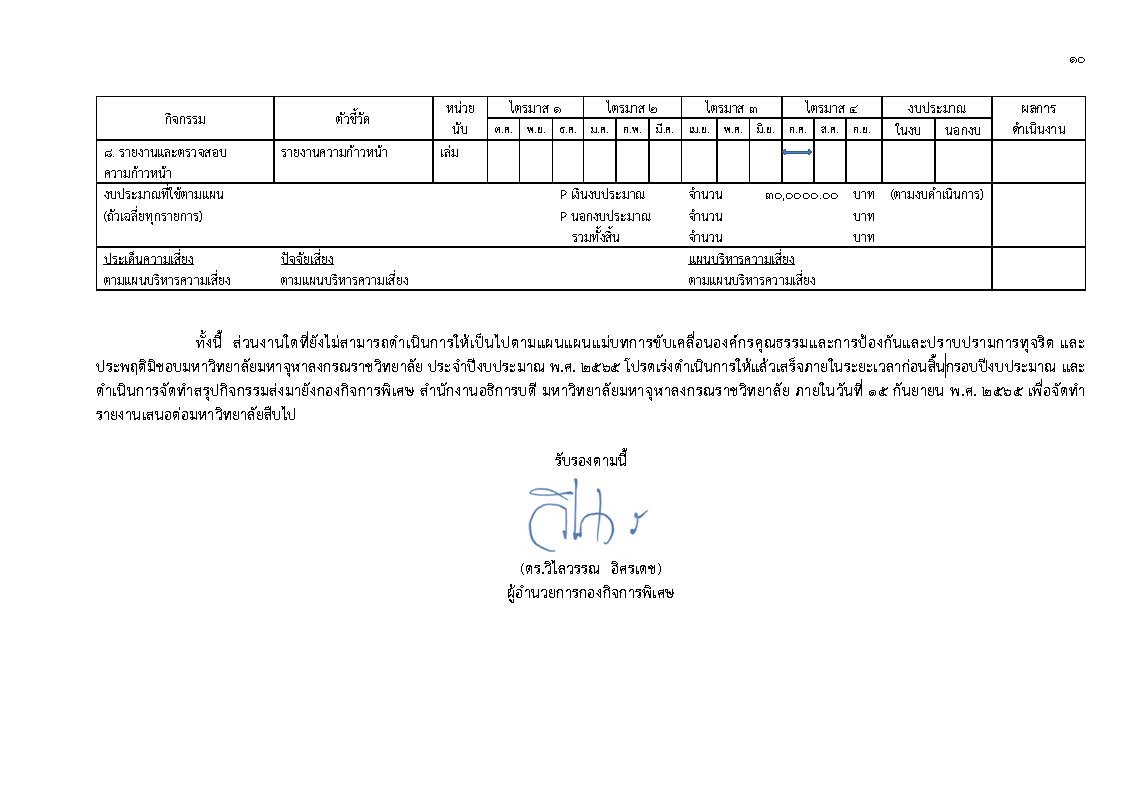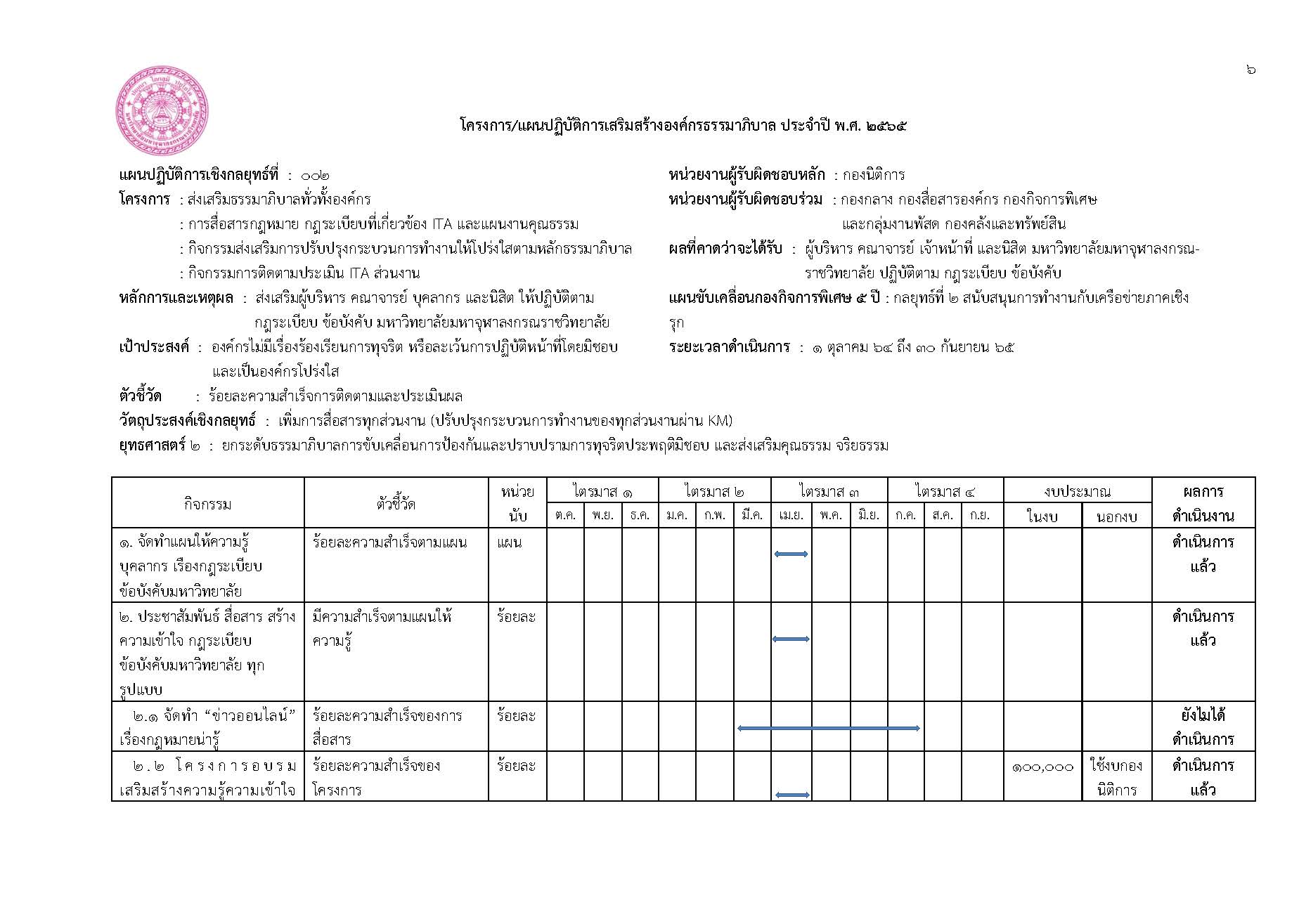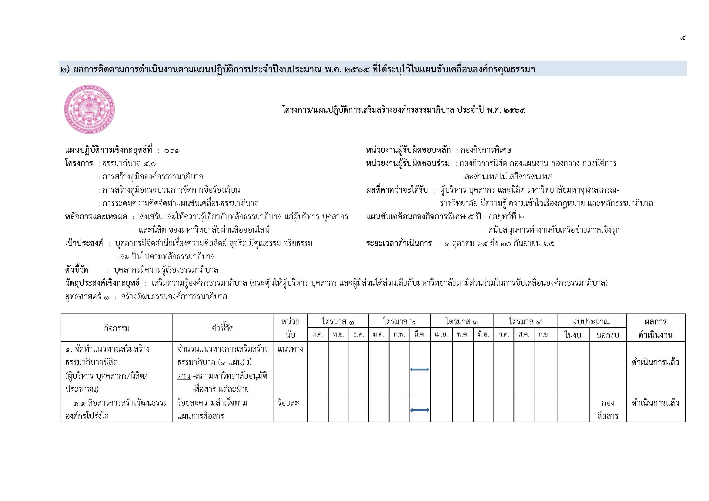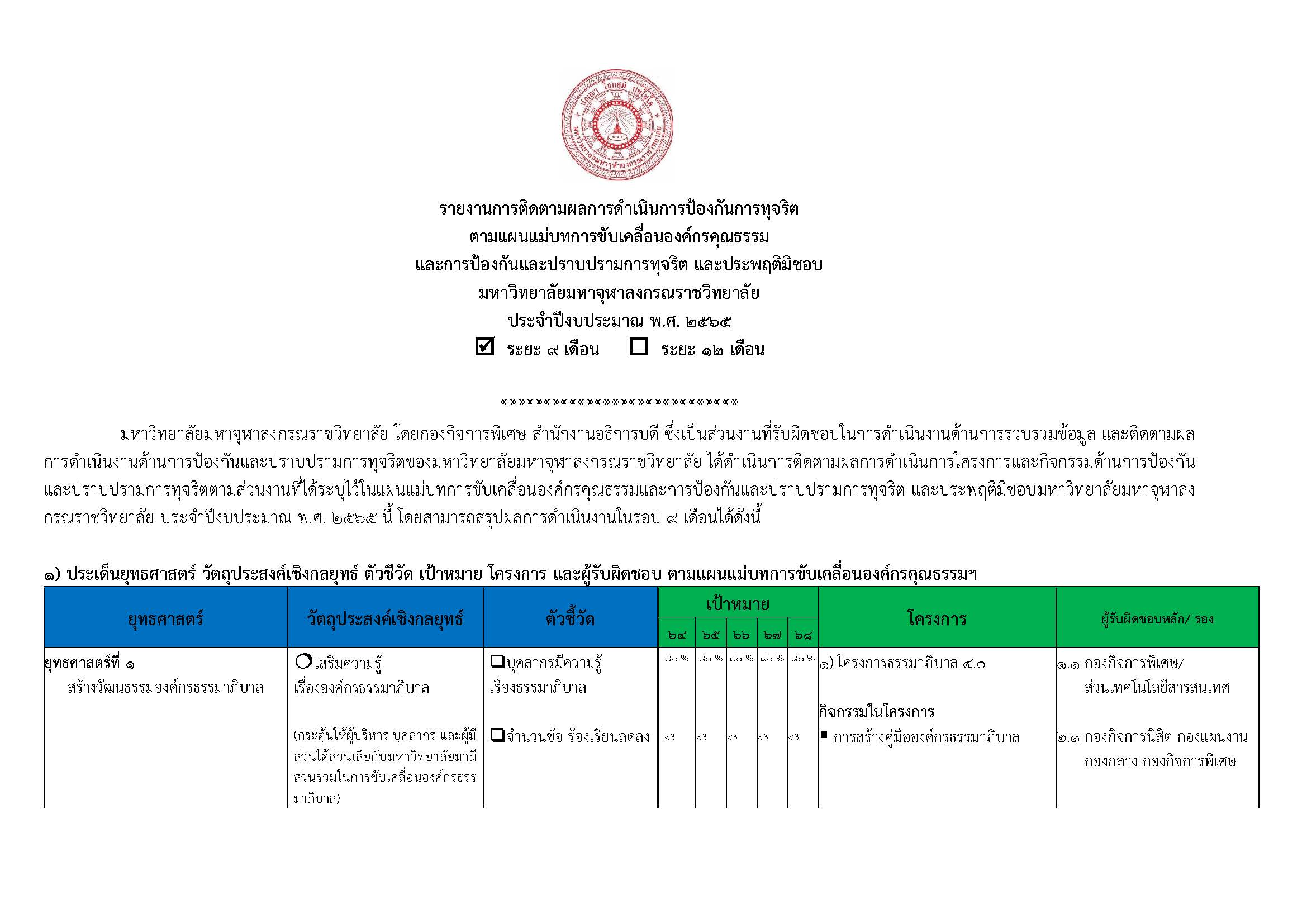 มหาวิทยาลัยมหาจุฬาลงกรณราชวิทยาลัย โดยกองกิจการพิเศษ สำนักงานอธิการบดี ซึ่งเป็นส่วนงานที่รับผิดชอบในการดำเนินงานด้านการรวบรวมข้อมูล และติดตามผลการดำเนินงานด้านการป้องกันและปราบปรามการทุจริตของมหาวิทยาลัยมหาจุฬาลงกรณราชวิทยาลัย ได้ดำเนินการติดตามผลการดำเนินการโครงการและกิจกรรมด้านการป้องกันและปราบปรามการทุจริตตามส่วนงานที่ได้ระบุไว้ในแผนแม่บทการขับเคลื่อนองค์กรคุณธรรมและการป้องกันและปราบปรามการทุจริต และประพฤติมิชอบมหาวิทยาลัยมหาจุฬาลงกรณราชวิทยาลัย ประจำปีงบประมาณ พ.ศ. ๒๕๖๕ นี้ โดยสามารถสรุปผลการดำเนินงานในรอบ ๙ เดือนได้ดังนี้