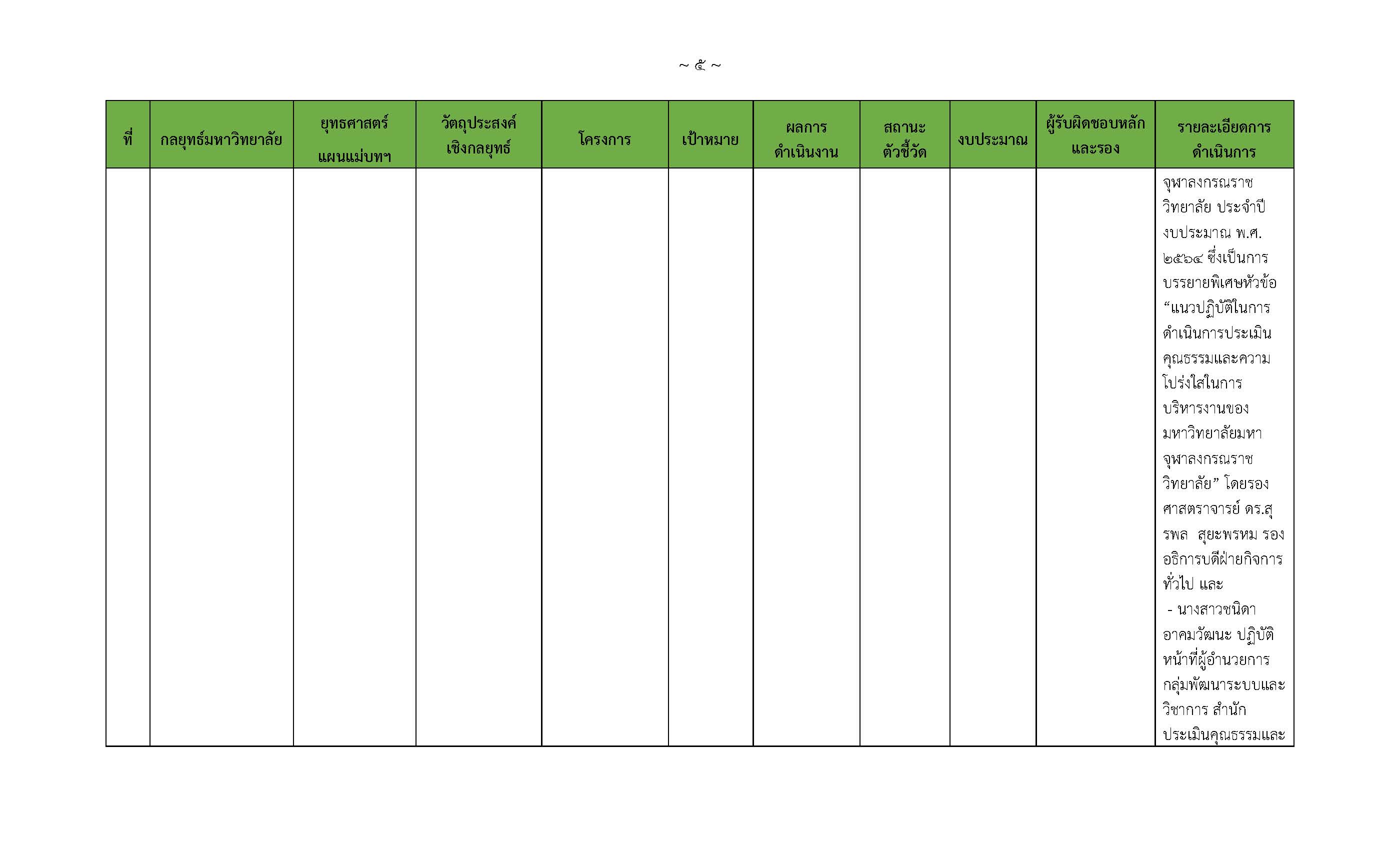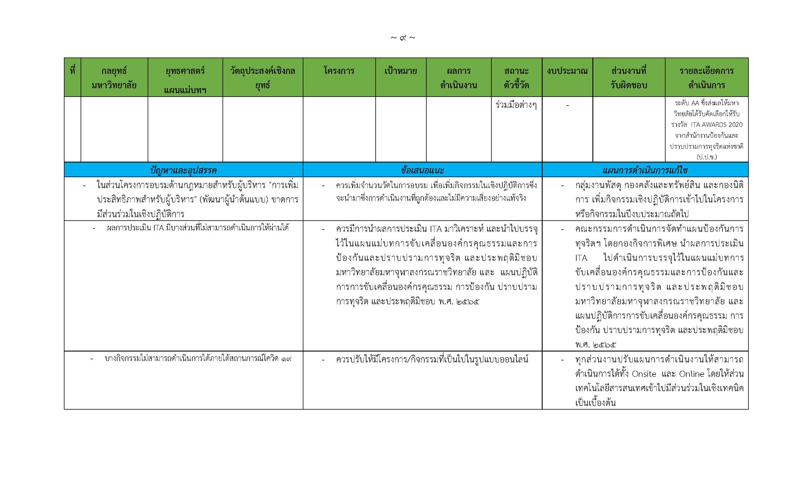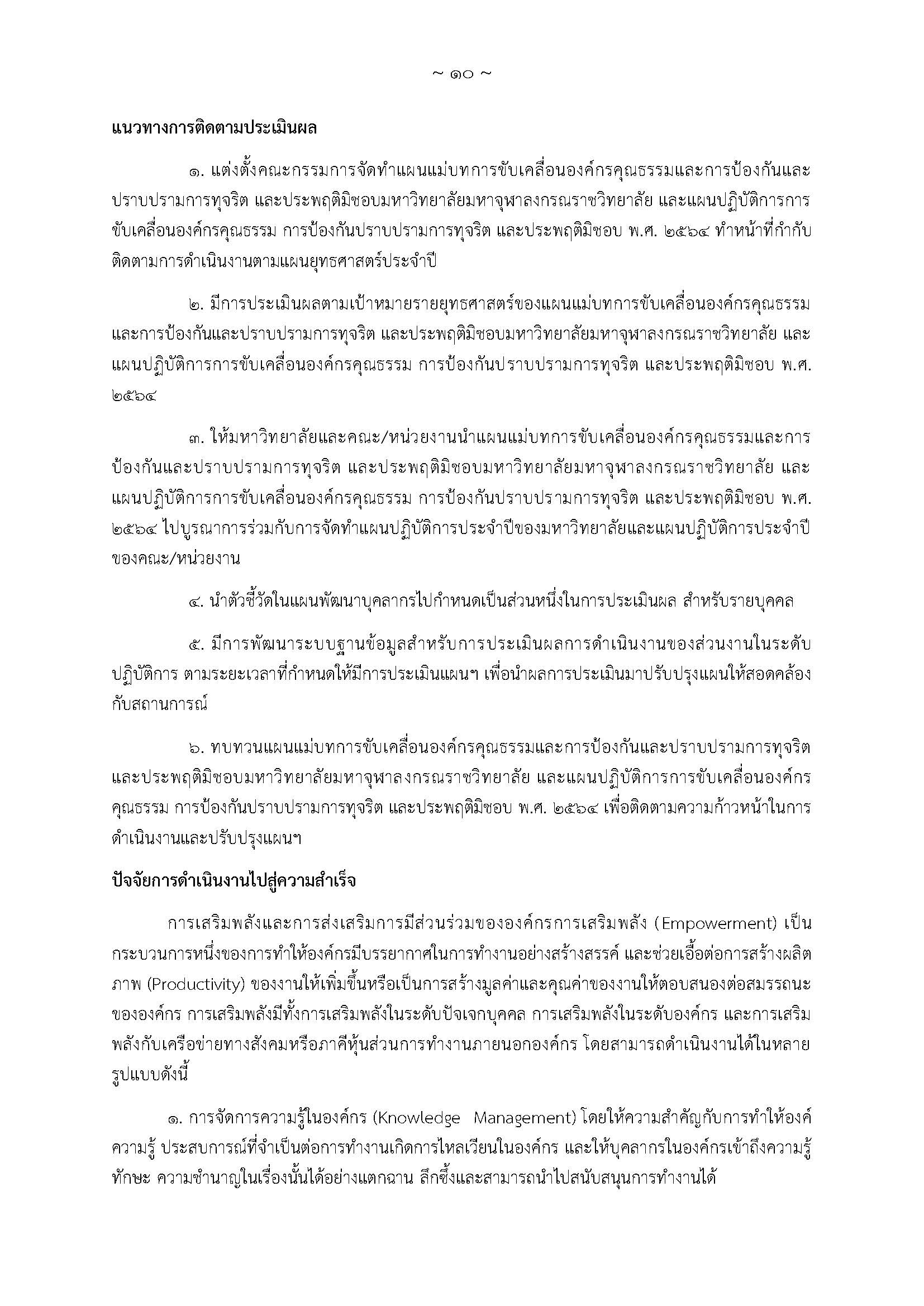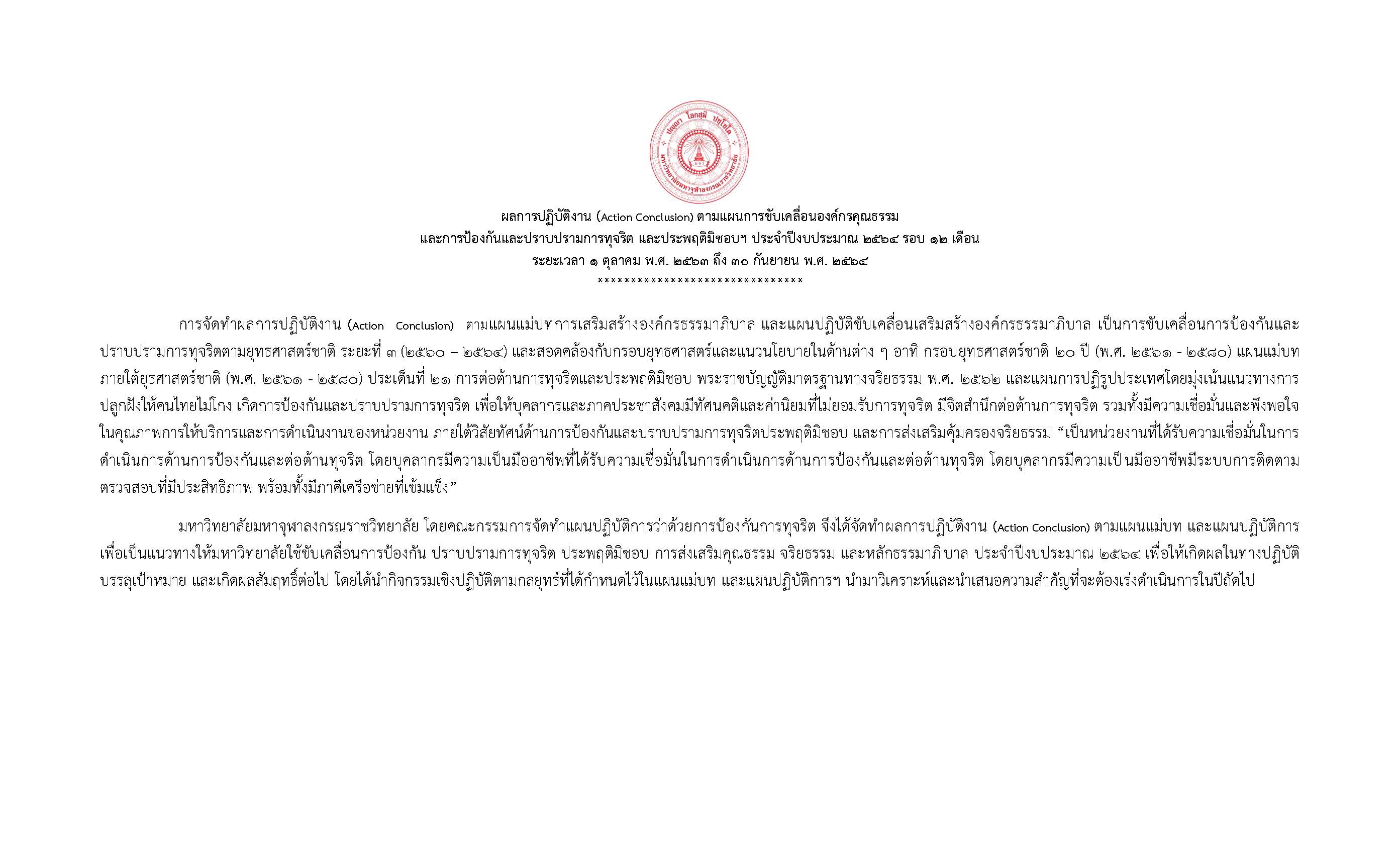 มหาวิทยาลัยมหาจุฬาลงกรณราชวิทยาลัย โดยคณะกรรมการจัดทำแผนปฏิบัติการว่าด้วยการป้องกันการทุจริต จึงได้จัดทำผลการปฏิบัติงาน (Action Conclusion) ตามแผนแม่บท และแผนปฏิบัติการ เพื่อเป็นแนวทางให้มหาวิทยาลัยใช้ขับเคลื่อนการป้องกัน ปราบปรามการทุจริต ประพฤติมิชอบ การส่งเสริมคุณธรรม จริยธรรม และหลักธรรมาภิบาล ประจำปีงบประมาณ ๒๕๖๔ เพื่อให้เกิดผลในทางปฏิบัติ บรรลุเป้าหมาย และเกิดผลสัมฤทธิ์ต่อไป โดยได้นำกิจกรรมเชิงปฏิบัติตามกลยุทธ์ที่ได้กำหนดไว้ในแผนแม่บท และแผนปฏิบัติการฯ นำมาวิเคราะห์และนำเสนอความสำคัญที่จะต้องเร่งดำเนินการในปีถัดไป