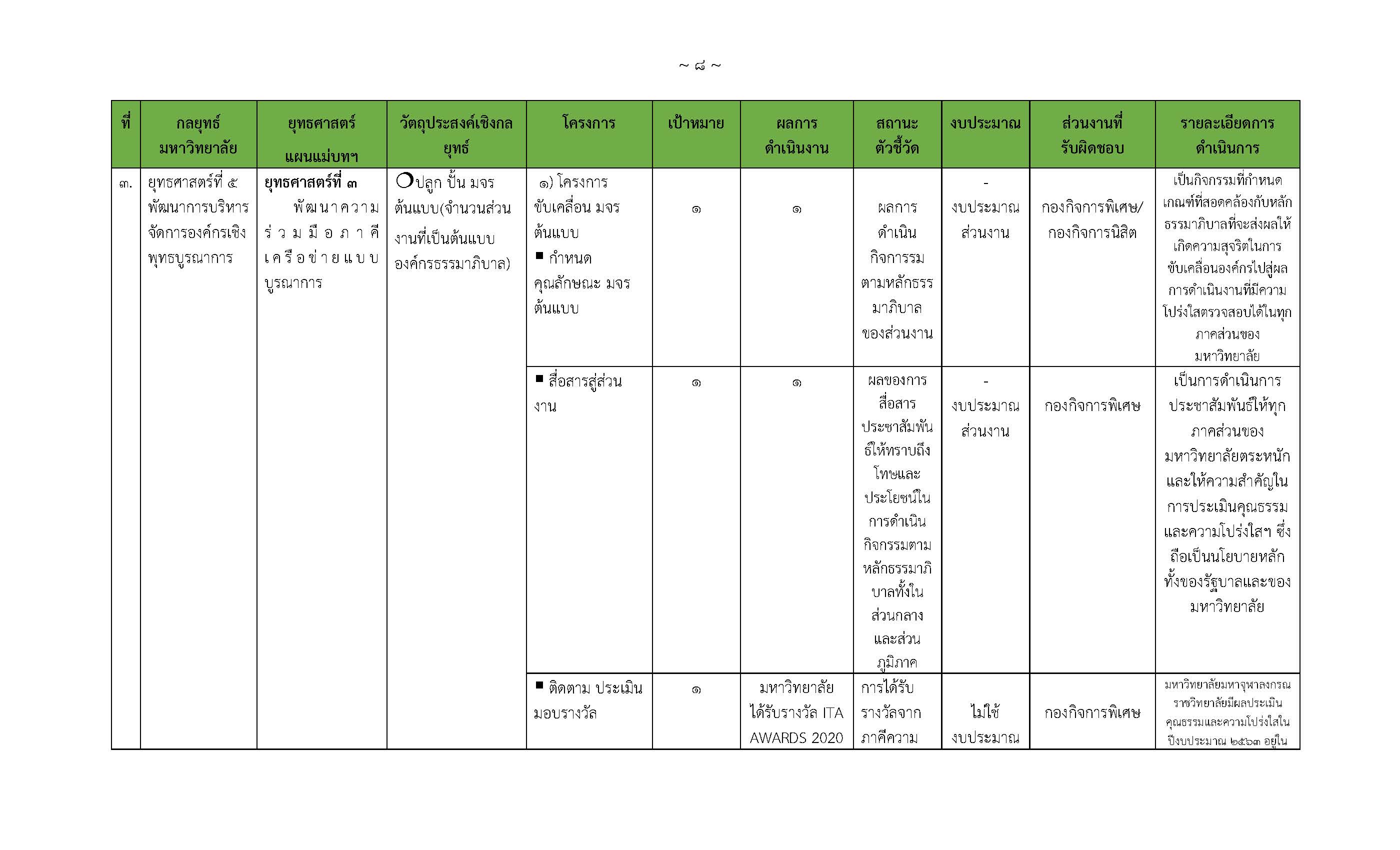 การจัดทำผลการปฏิบัติงาน (Action Conclusion) ตามแผนแม่บทการเสริมสร้างองค์กรธรรมาภิบาล และแผนปฏิบัติขับเคลื่อนเสริมสร้างองค์กรธรรมาภิบาล เป็นการขับเคลื่อนการป้องกันและปราบปรามการทุจริตตามยุทธศาสตร์ชาติ ระยะที่ ๓ (๒๕๖๐ – ๒๕๖๔) และสอดคล้องกับกรอบยุทธศาสตร์และแนวนโยบายในด้านต่าง ๆ อาทิ กรอบยุทธศาสตร์ชาติ ๒๐ ปี (พ.ศ. ๒๕๖๑ – ๒๕๘๐) แผนแม่บทภายใต้ยุธศาสตร์ชาติ (พ.ศ. ๒๕๖๑ – ๒๕๘๐) ประเด็นที่ ๒๑ การต่อต้านการทุจริตและประพฤติมิชอบ พระราชบัญญัติมาตรฐานทางจริยธรรม พ.ศ. ๒๕๖๒ และแผนการปฏิรูปประเทศโดยมุ่งเน้นแนวทางการปลูกฝังให้คนไทยไม่โกง เกิดการป้องกันและปราบปรามการทุจริต เพื่อให้บุคลากรและภาคประชาสังคมมีทัศนคติและค่านิยมที่ไม่ยอมรับการทุจริต มีจิตสำนึกต่อต้านการทุจริต รวมทั้งมีความเชื่อมั่นและพึงพอใจในคุณภาพการให้บริการและการดำเนินงานของหน่วยงาน ภายใต้วิสัยทัศน์ด้านการป้องกันและปราบปรามการทุจริตประพฤติมิชอบ และการส่งเสริมคุ้มครองจริยธรรม “เป็นหน่วยงานที่ได้รับความเชื่อมั่นในการดำเนินการด้านการป้องกันและต่อต้านทุจริต โดยบุคลากรมีความเป็นมืออาชีพที่ได้รับความเชื่อมั่นในการดำเนินการด้านการป้องกันและต่อต้านทุจริต โดยบุคลากรมีความเป็นมืออาชีพมีระบบการติดตามตรวจสอบที่มีประสิทธิภาพ พร้อมทั้งมีภาคีเครือข่ายที่เข้มแข็ง”