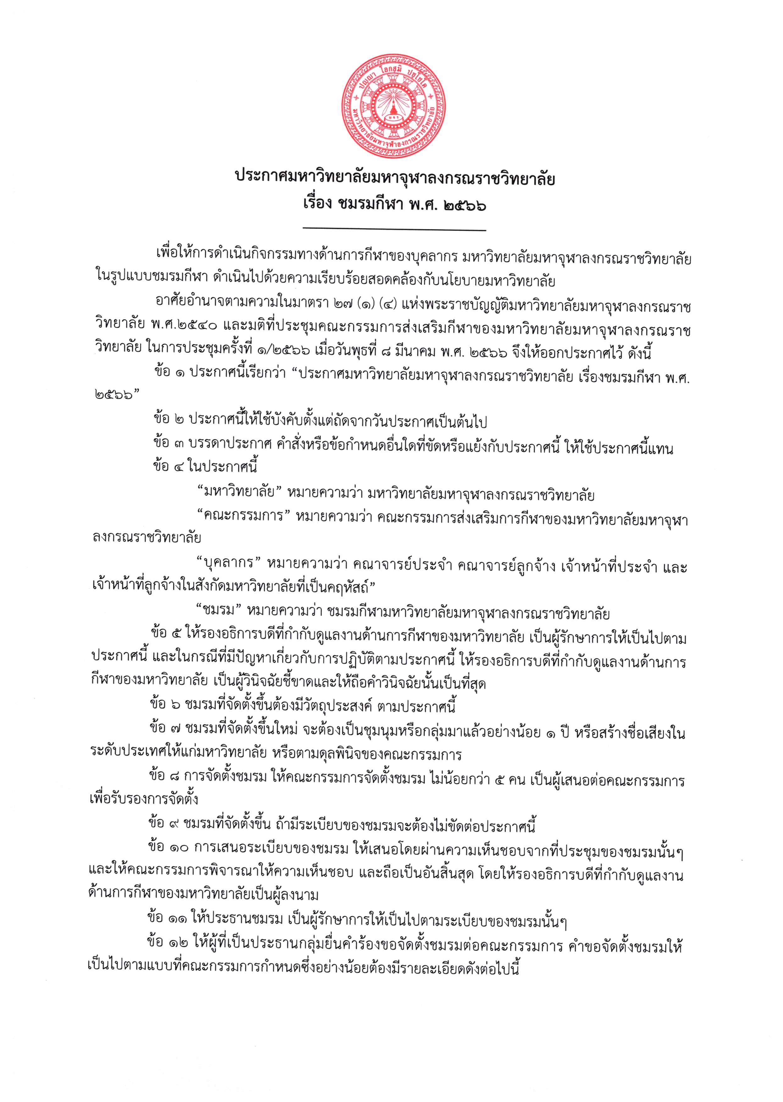 ประกาศฯ ว่าด้วยเรื่องจัดตั้งชมรมกีฬา เพื่อให้การดำเนินกิจกรรมทางด้านการกีฬาของบุคลากรมหาวิทยาลัยมหาจุฬาลงกรณราชวิทยาลัยดำเนินไปด้วยความเรียบร้อยสอดคล้องกับนโยบายมหาวิทยาลัย จึงได้มีประกาศมหาวิทยาลัยฯ เรื่อง ชมรมกีฬา พ.ศ. ๒๕๖๖ ขึ้น ดังนี้ ดาวน์โหลดเอกสารจัดตั้งชมรม >>>>> https://drive.google.com/drive/folders/1UTKMwdiYKISEMJt7LJp_1PxwZHECCGmv