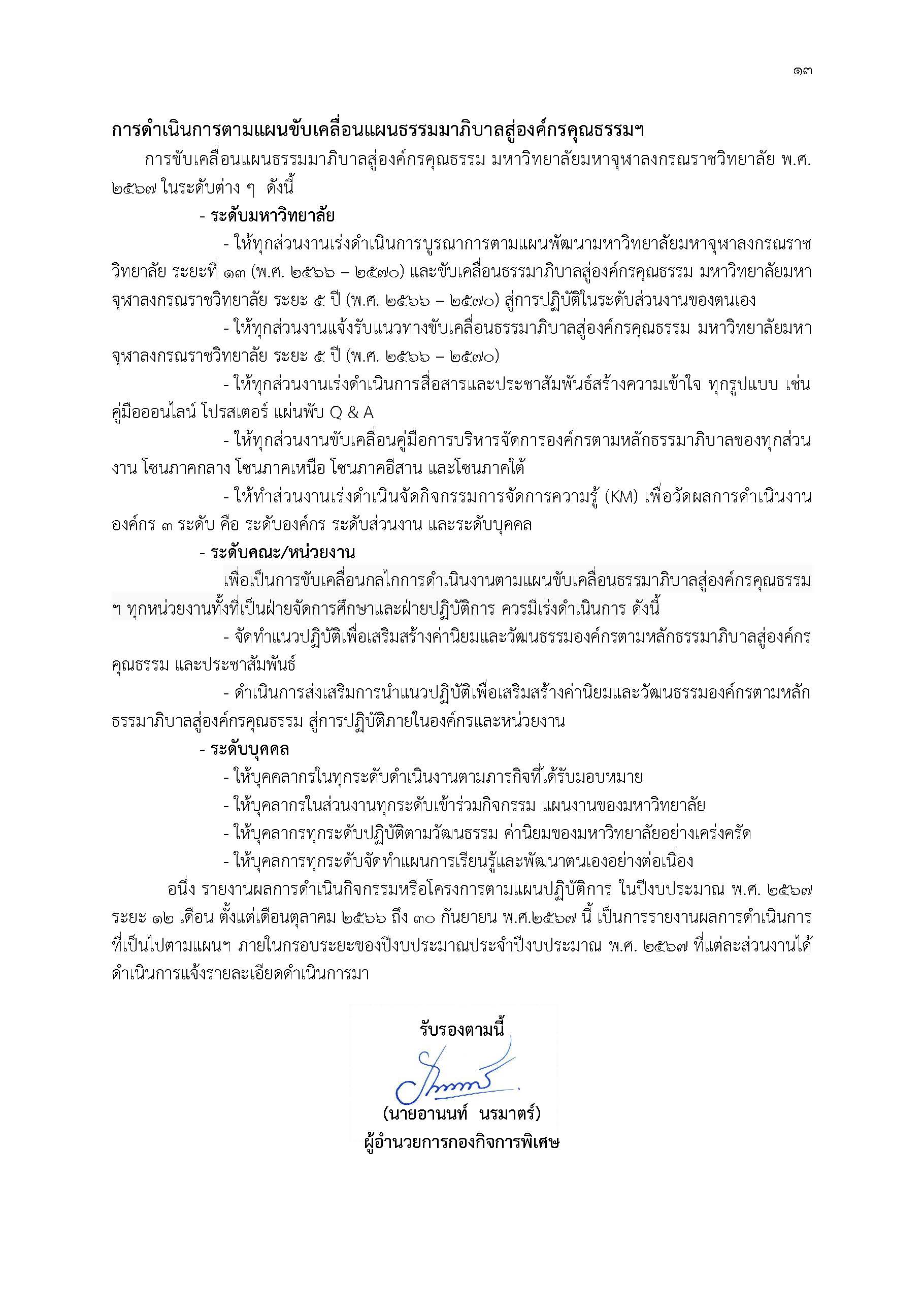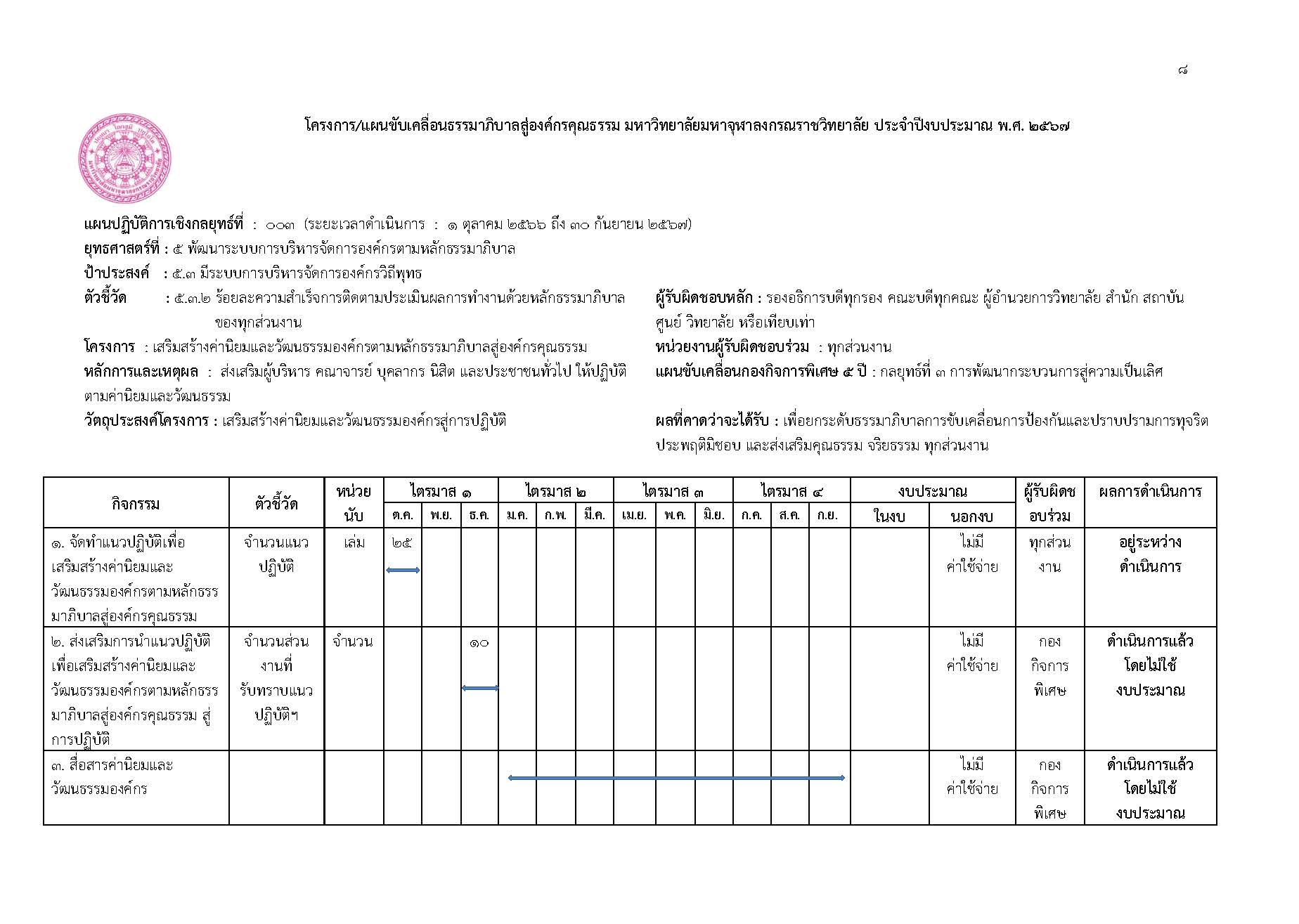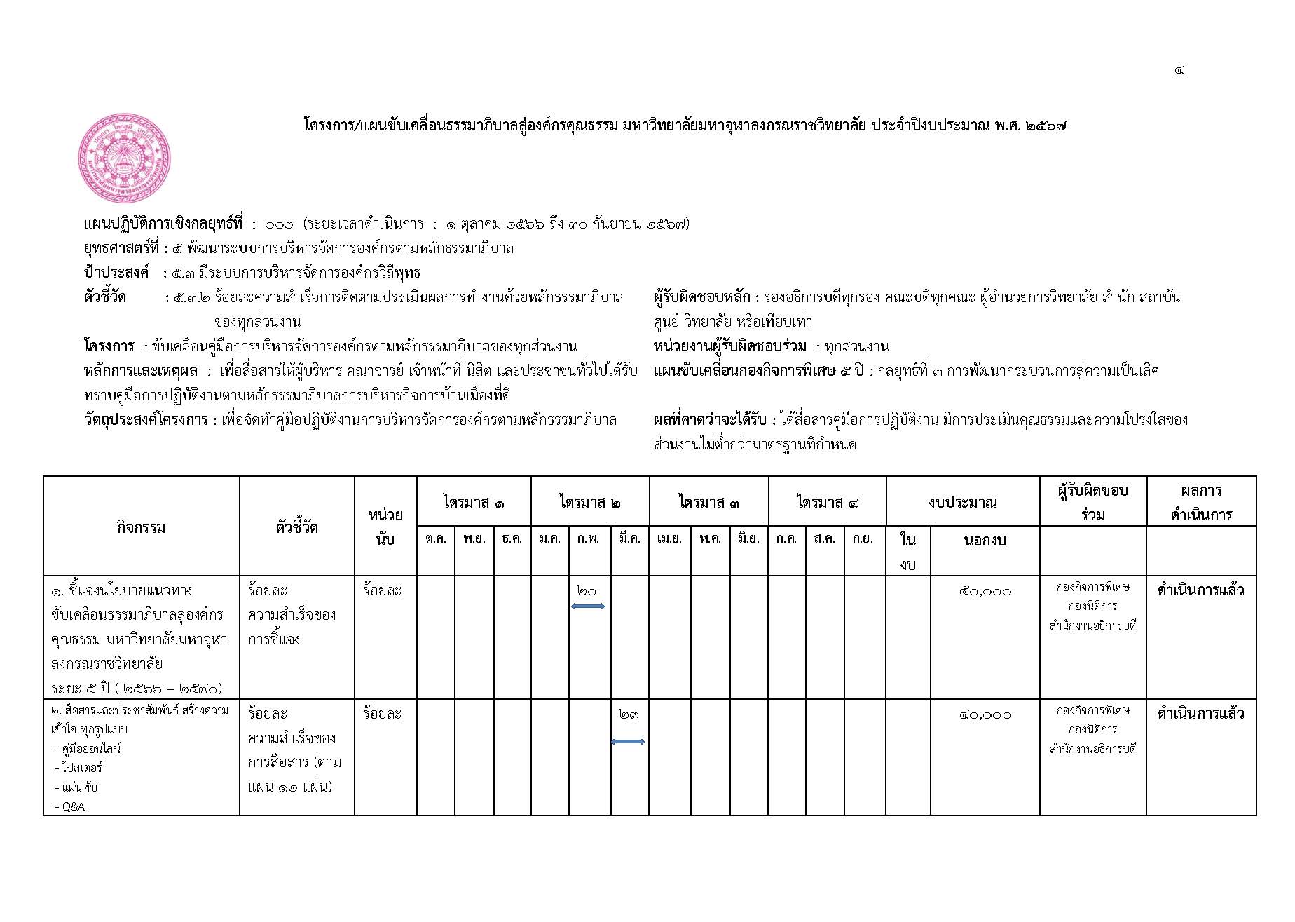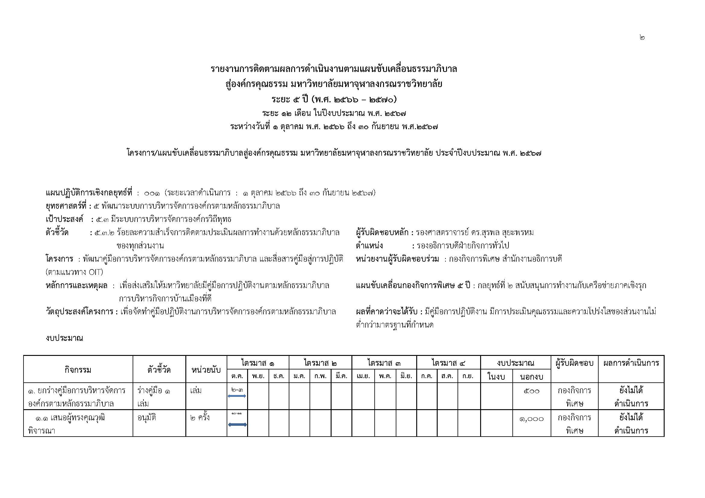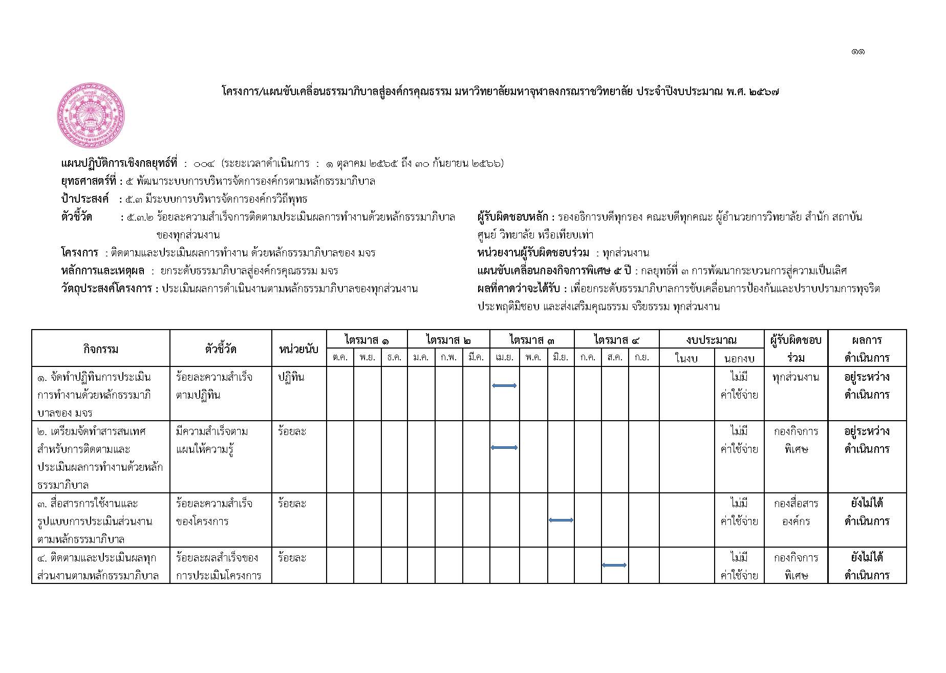 ตามที่มหาวิทยาลัยได้จัดทำแผนขับเคลื่อนธรรมาภิบาลสู่องค์กรคุณธรรมมหาวิทยาลัยมหาจุฬาลงกรณราชวิทยาลัยระยะ ๕ ปี (พ.ศ. ๒๕๖๖ – ๒๕๗๐) ตามแผนพัฒนามหาวิทยาลัยมหาจุฬาลงกรณราชวิทยาลัยระยะที่ ๑๓ (พ.ศ. ๒๕๖๖ – ๒๕๗๐ ได้กำหนดไว้ในยุทธศาสตร์ที่ ๕ ด้านการพัฒนาการบริหารจัดการองค์กร เป้าประสงค์ที่ ๕.๓ มีระบบการบริหารจัดการองค์กรวิถีพุทธ ตัวชี้วัดที่ ๕.๓.๒ ร้อยละความสำเร็จการติดตามและประเมินผลการทำงานด้วยหลักธรรมาภิบาล ในกลยุทธ์ที่ ๕.๓.๒ ว่าด้วยการส่งเสริมและพัฒนาระบบและกลไกการบริหารจัดการองค์กรตามหลักธรรมาภิบาล ซึ่งให้ทุกส่วนงานได้ถือปฏิบัติเพื่อเป็นแนวทางการดำเนินงานและการขับเคลื่อนธรรมาภิบาลไปสู่องค์กรคุณธรรมฯ โดยกองกิจการพิเศษ สำนักงานอธิการบดี ได้ดำเนินการติดตามผลการดำเนินการ ของปีงบประมาณ พ.ศ. ๒๕๖๗ ตั้งแต่วันที่ ๑ ตุลาคม พ.ศ. ๒๕๖๖ ถึง ๓๐ กันยายน พ.ศ. ๒๕๖๗ ซึ่งมีรายละเอียดรายงานผลการติดตามผลการดำเนินงานดังต่อไปนี้