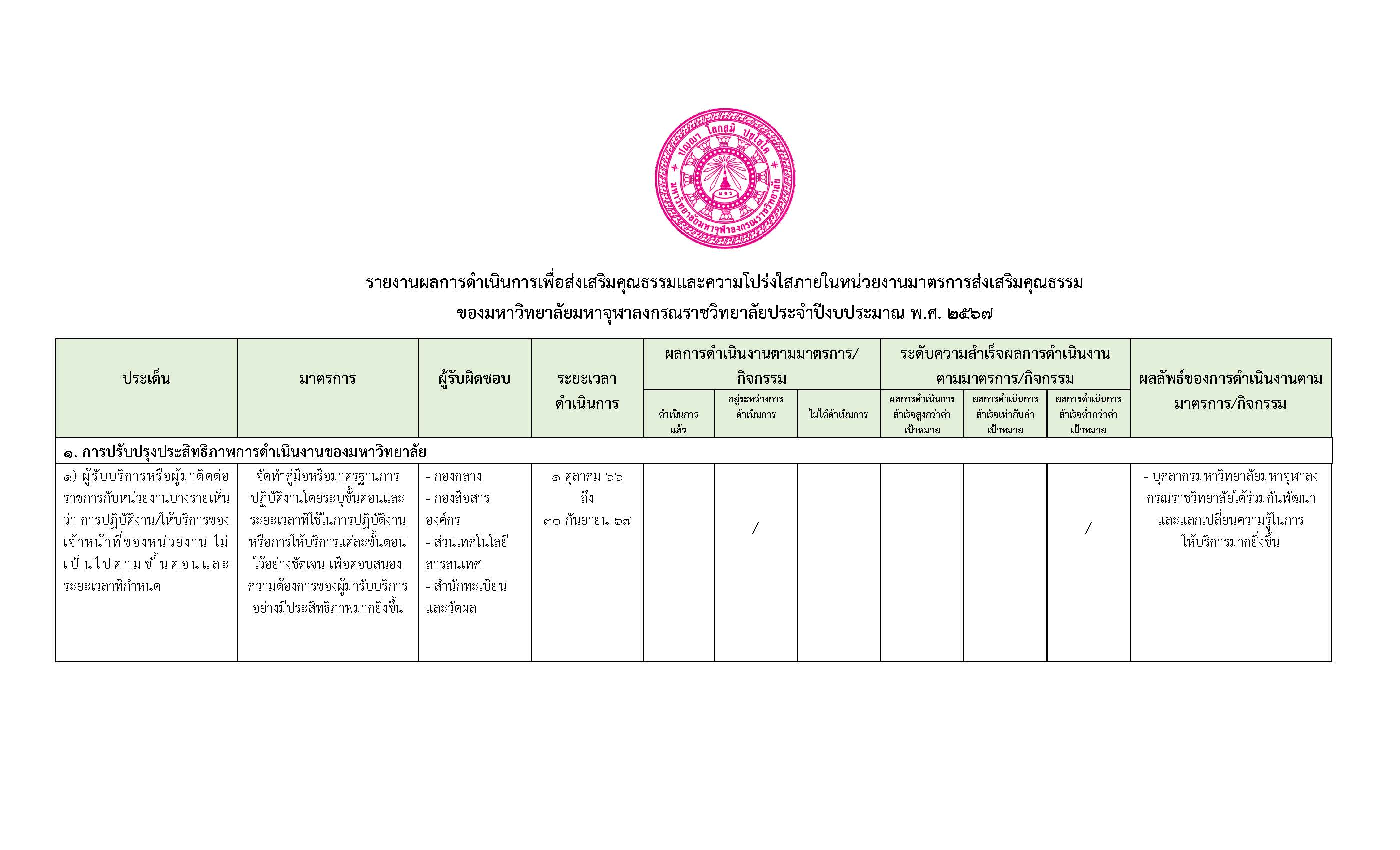 รายงานผลการดำเนินการเพื่อส่งเสริมคุณธรรมและความโปร่งใสภายในหน่วยงานมาตรการส่งเสริมคุณธรรม ของมหาวิทยาลัยมหาจุฬาลงกรณราชวิทยาลัย ประจำปีงบประมาณ พ.ศ. ๒๕๖๗ เพื่อเป็นการส่งเสริมคุณธรรมและความโปร่งใสภายในหน่วยงานมาตรการส่งเสริมคุณธรรม ของมหาวิทยาลัยมหาจุฬาลงกรณราชวิทยาลัย โดยผ่านการปฏิบัติหน้าที่ในพันธกิจหลักของมหาวิทยาลัย จึงได้จัดทำรายงานผลการดำเนินการดังกล่าว ในปีงบประมาณ พ.ศ.๒๕๖๗ ดาวน์โหลดไฟล์ PDF